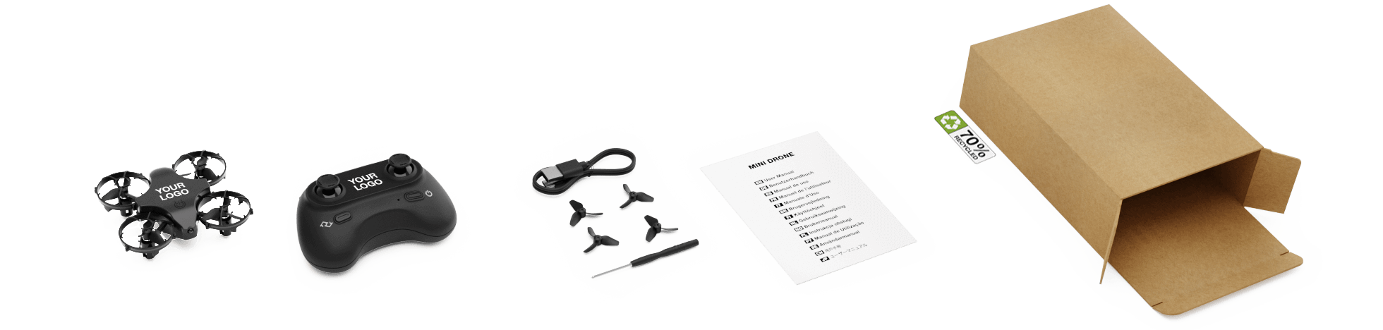 With 3 dedicated branding areas on the drone unit itself and an additional large branding area on the controller, your logo and message will be highly visible during flight and on the ground.