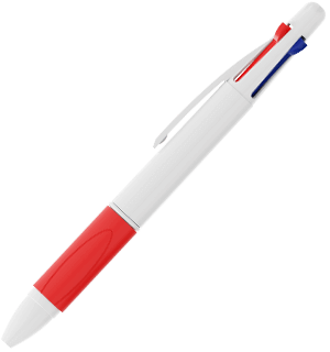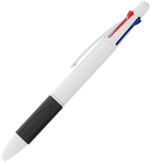 The Quad is a classic 4 color pen that boasts blue, red, green and black ballpoints in the 1 model. Each color option reveals and retracts via the click sliders at the top of the pen. The comfortable thermoplastic rubber grip is available in a variety of colors to complement your brand style. The exterior white shell can be Photo Printed with your logo, slogan and more.